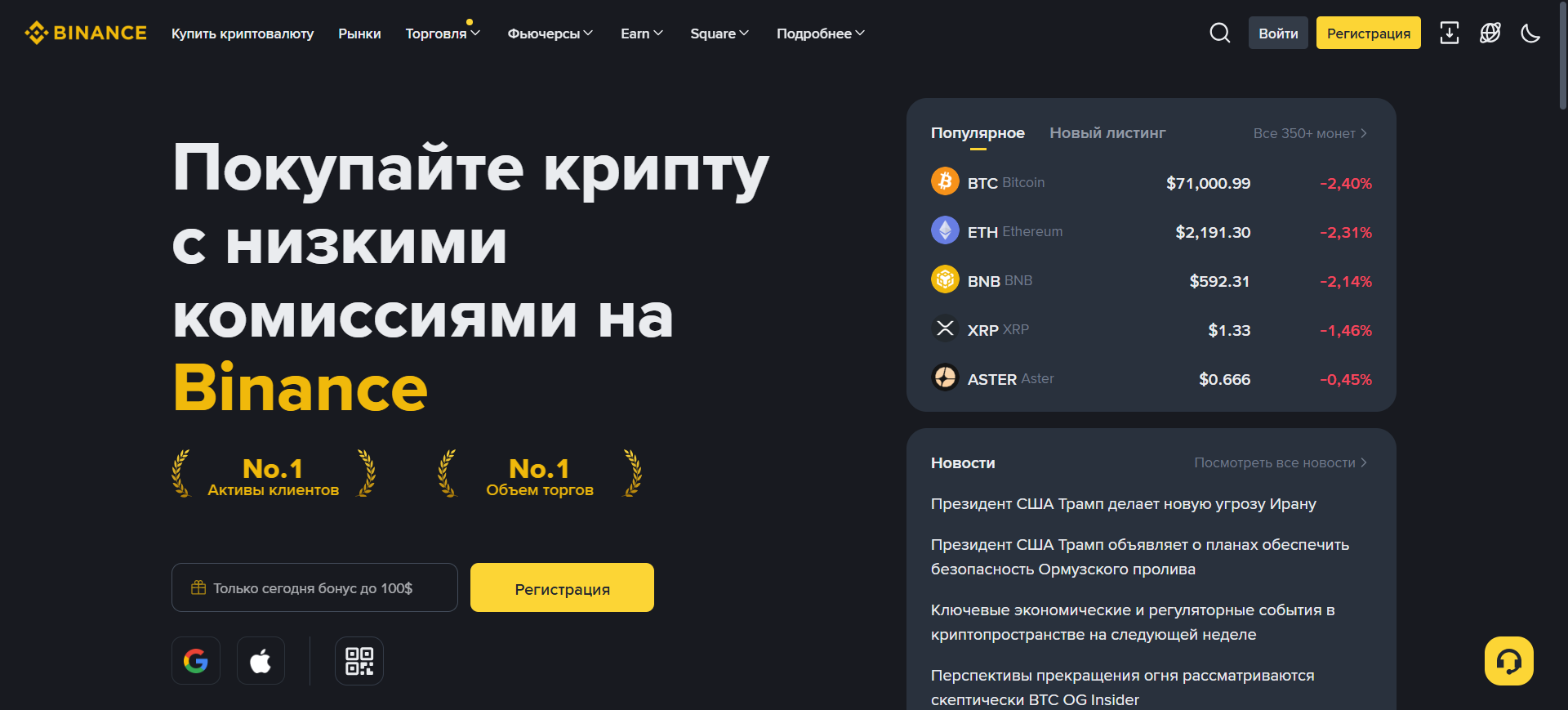 Binance — крупнейшая криптоплатформа с торговлей, стейкингом, P2P и NFT. После санкций 2022 года российские карты перестали приниматься.