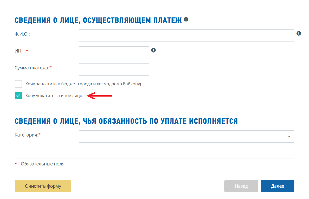 - Найдите и поставьте галочку в чекбоксе «Хочу уплатить за иное лицо». Это главный шаг, который меняет суть платежа.