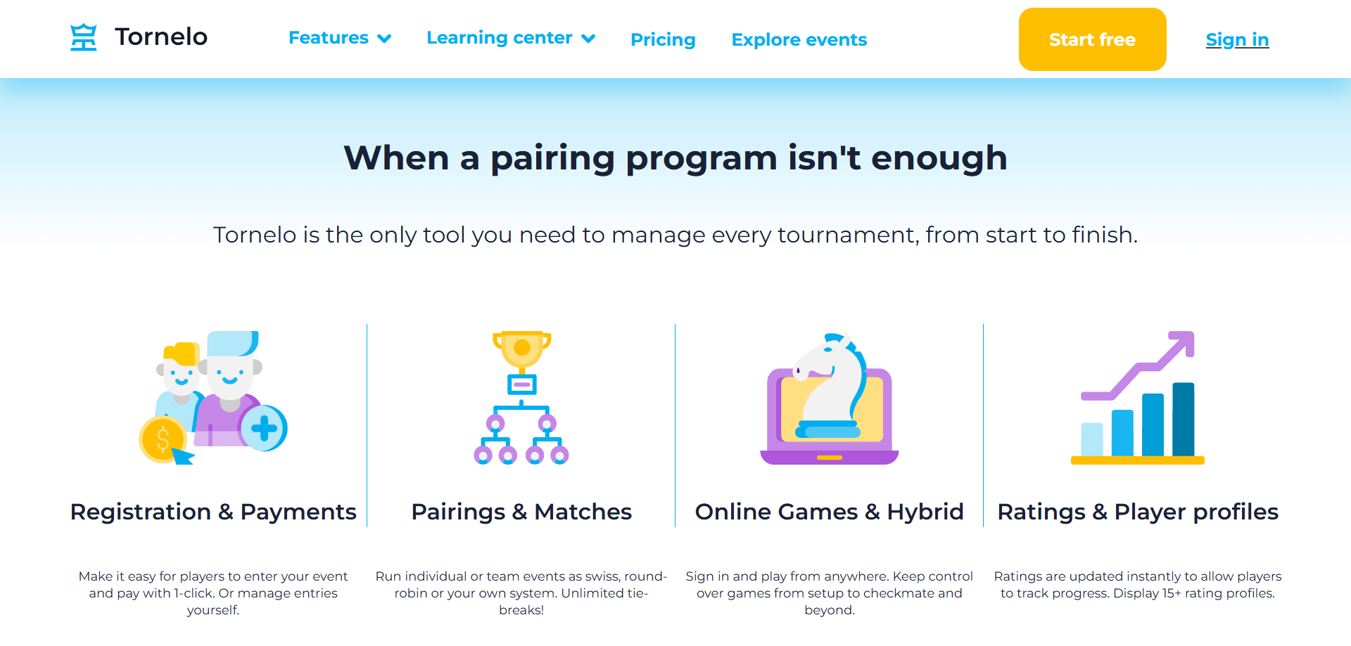 Tornelo – место, где вы найдёте всё необходимое для проведения шахматных турниров, рейтинговых игр и решения организационных вопросов. Причём ресурс полезен как для администрации мероприятий, так и для участников. Основные возможности «Торнело» включают: