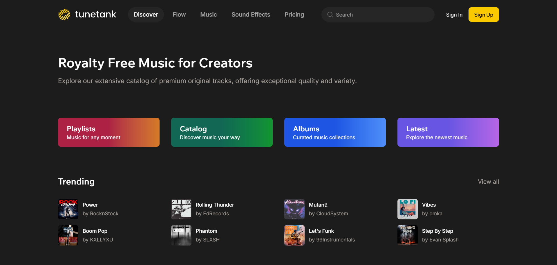 Tunetank – одна из крупнейших онлайн-библиотек, ставшая настоящей находкой для создателей видео, подкастеров, разработчиков игр и маркетологов. Платформа предлагает внушительную коллекцию треков и звуковых эффектов, которые можно использовать в разнообразных проектах, причём абсолютно легально. Основная «фишка» Tunetank – музыка по подписке, что означает: вы платите один раз, а используете треки бесконечно, без отчисления авторских вознаграждений за каждый просмотр или скачивание.