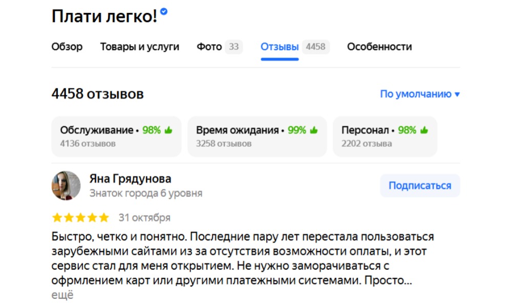 Клиенты часто отмечают нас за удобство, оперативную и эффективную работу. У «Плати Легко!» более 4400 отзывов на Яндексе со средней оценкой 5.0.