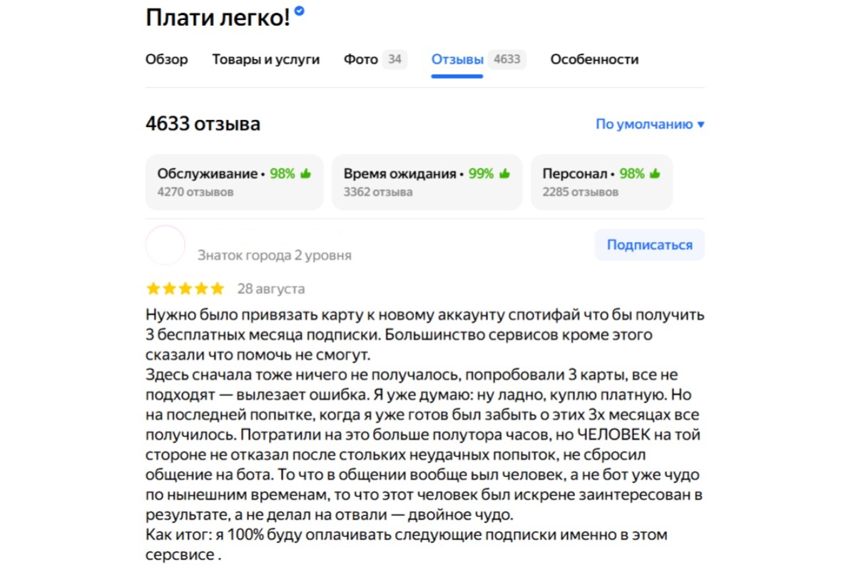 «Как итог: я 100% буду оплачивать следующие подписки именно в этом сервисе. Вы не просто сделали то, что не смогли другие, вы сделали это тогда, когда, кажется, уже и сами не верили, что получится. Это дорогого стоит».