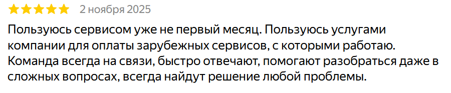 «Пользуюсь сервисом уже не первый месяц. Пользуюсь услугами компании для оплаты зарубежных сервисов, с которыми работаю. Команда всегда на связи, быстро отвечают, помогают разобраться даже в сложных вопросах, всегда найдут решение любой проблемы».