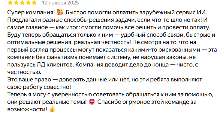 «Супер компания! Быстро помогли оплатить зарубежный сервис ИИ. Предлагали разные способы решения задачи, если что-то шло не так! И самое главное — как итог: смогли помочь все решить и провести оплату. Несмотря на то, что на первый взгляд процессы могут показаться какими-то рискованными — эта компания без фанатизма понимает систему, не нарушает законы, не пользуется ЛД клиентов. Компания доводит дело до конца — чисто, с честностью».