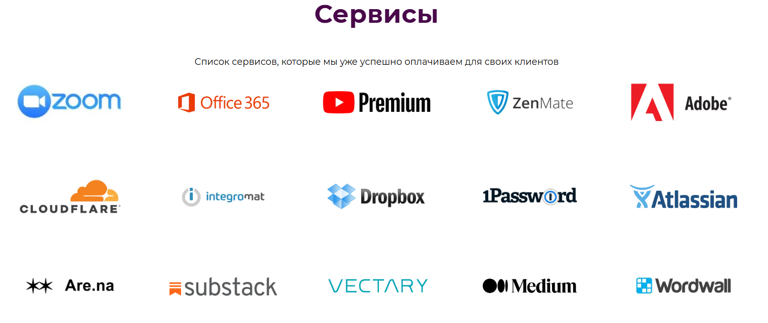 И список сервисов, которые мы уже помогли оплатить своим клиентам