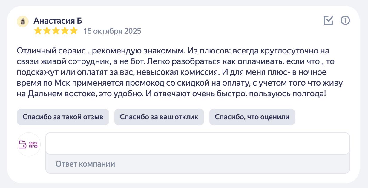 Спустя полгода активного использования «Плати Легко!» Анастасия с уверенностью рекомендует нас своим друзьям и коллегам. Вот ключевые преимущества, которые она выделила в своем отзыве: