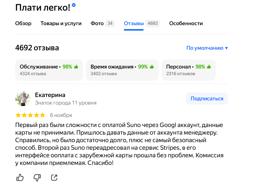 Екатерина теперь регулярно пользуется «Плати Легко!» не только для оплаты Suno, но и других творческих сервисов.