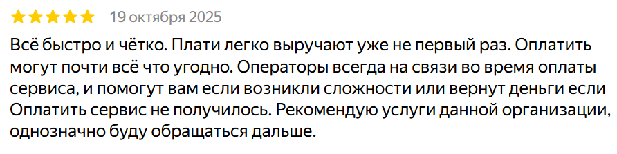 «Рекомендую услуги данной организации, однозначно буду обращаться дальше. Меня подкупает не только скорость, но и честность: если оплатить не получится — возвращаете деньги. Это внушает доверие. Теперь я знаю: если что-то нужно оплатить за границей — билеты, отели, визы, подписки, — я просто пишу вам, и вопрос решен».