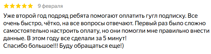 «Уже второй год подряд ребята помогают оплатить гугл подписку. Все очень быстро, четко, на все вопросы отвечают. Первый раз было сложно самостоятельно настроить оплату, но они помогли мне правильно внести данные. В этом году все сделали за 5 минут!»
